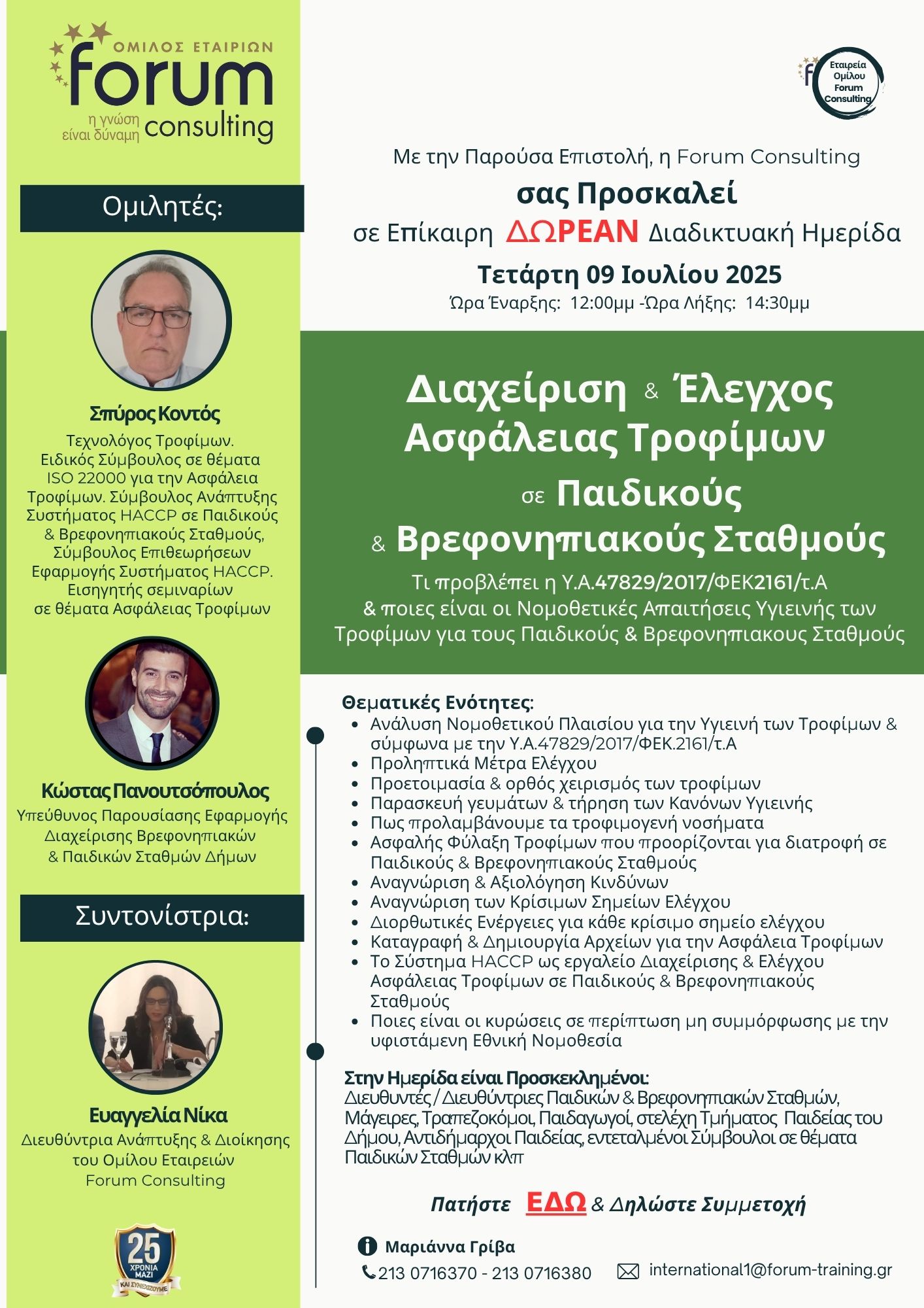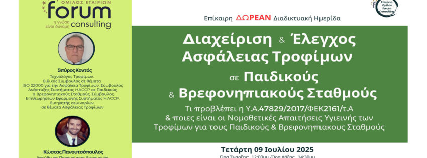 Διαχείριση & Έλεγχος Ασφάλειας Τροφίμων σε Παιδικούς - Βρεφονηπιακούς Σταθμούς