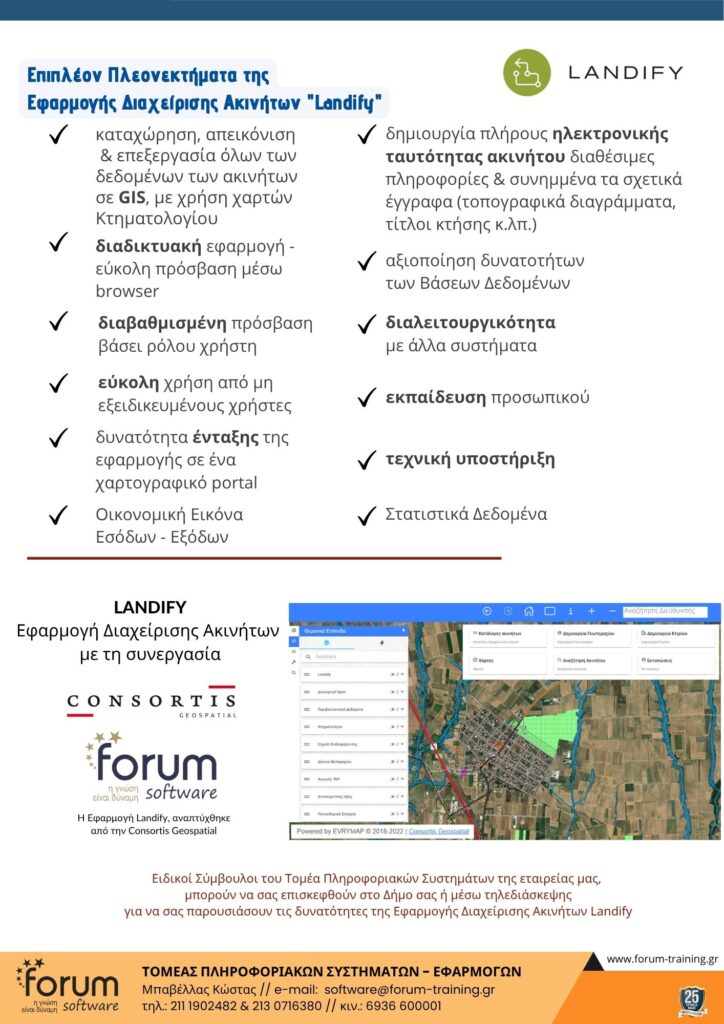 Σας ευχαριστούμε που μας δίνετε τη δυνατότητα να σας αποστείλουμε ενημερωτικό υλικό σχετικά με την Πλατφόρμα Καταγραφής, Διαχείρισης & Αξιοποίησης Δημοτικής Περιουσίας “Landify”.